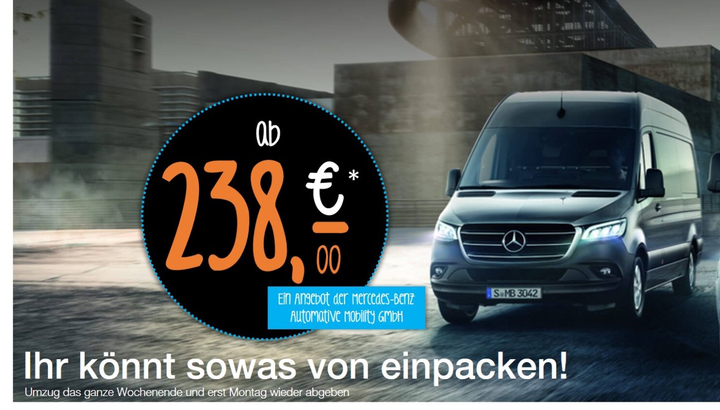 Stressfrei umziehen mit einem garantierten Mercedes-Benz Sprinter Transporter. 3,30m Laderaumlänge - Platz genug für deinen Umzug. Ein Angebot der Mercedes-Benz Automotive Mobility GmbH - Van Rental